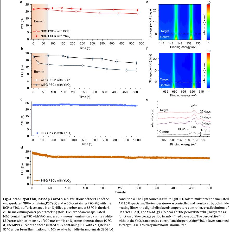 研究人员为解决太阳能电池在实际运行条件下的长期稳定性问题采用了新型缓冲材料——具有出色热稳定性和多功能性的氧化镱(YbOx)。顺利获得可扩展的热蒸发方法成功制备了YbOx薄膜,并进行了详细分析(如图1所示)。并且在光照条件下跟踪了密封条件下PSCs的稳定性,证实了YbOx缓冲层显著提高了PSCs的长期操作稳定性。即使在多次外部应力下,YbOx缓冲层的器件在85 C高温和高湿度条件下仍能保持较好的稳定性(如图2所示)。